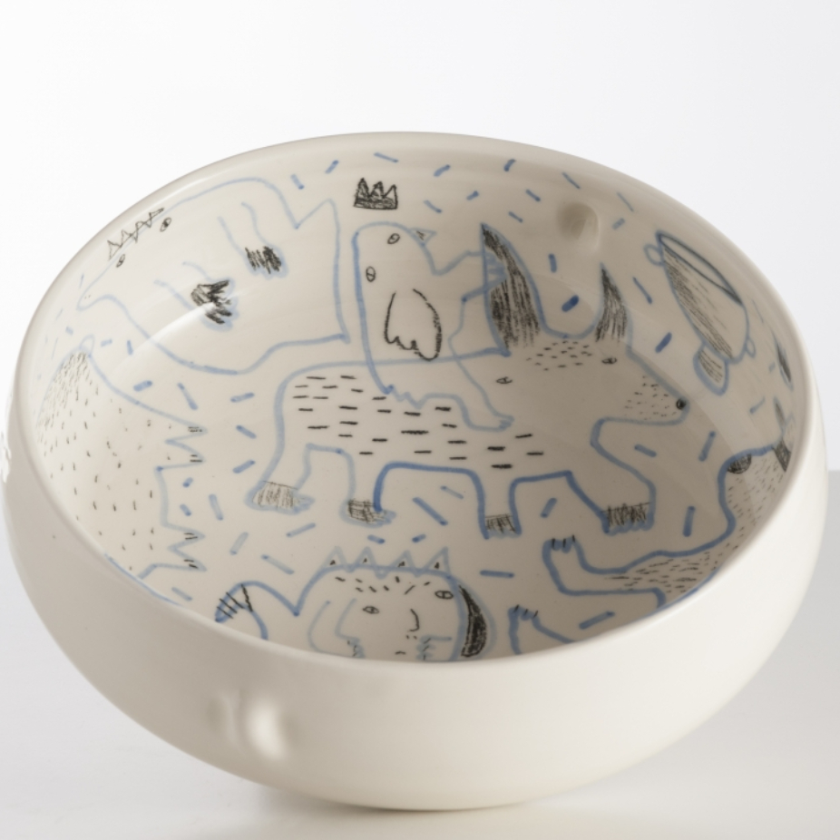 Le travail en céramique de Paul Guidera évoque de façon générale la naïveté et la spontanéité. Par un trait qu’on pourrait juger enfantin, Paul dessine partout et sans cesse des monstres – mais de gentils monstres ! Au gré de son imagination et des histoires, l’artiste rajoute chaque jour des créatures à son bestiaire imaginaire. Paul s’inscrit donc dans un rapport illustratif de la céramique mais ses pièces sont aussi conçues pour être utilisées au quotidien. Humbles, parlantes et ludiques, Pauline souhaite qu’elles touchent autant les adultes que les enfants.