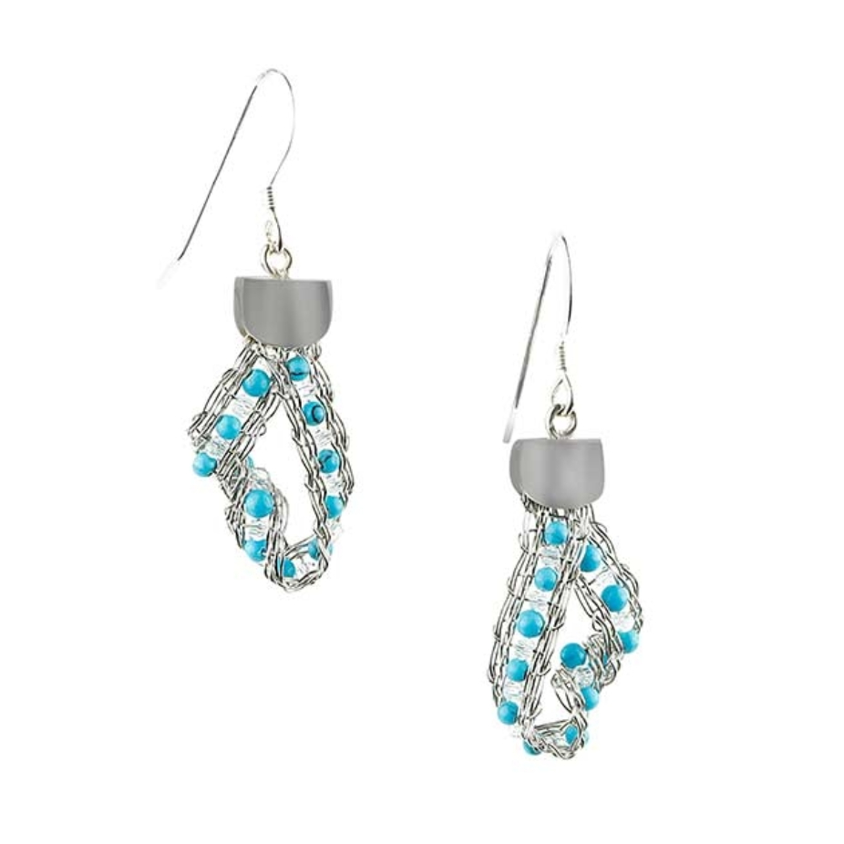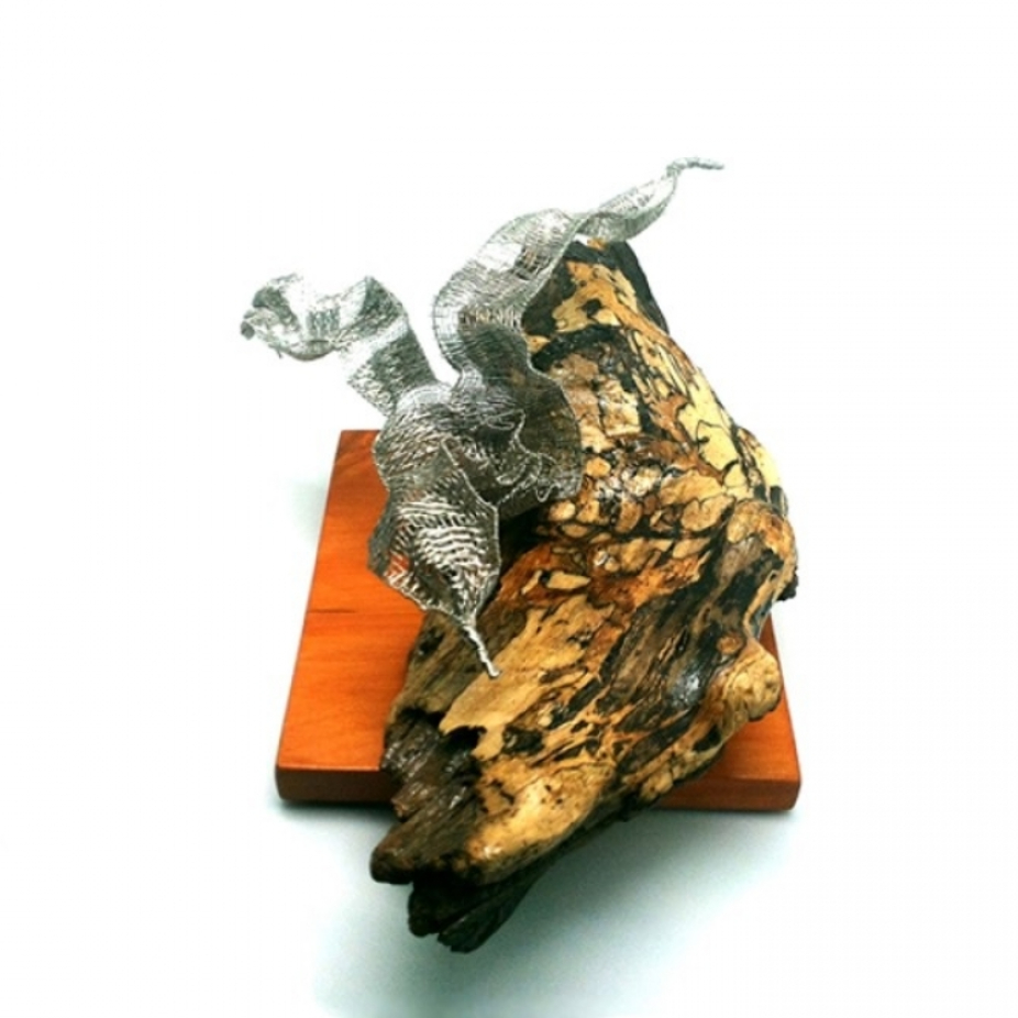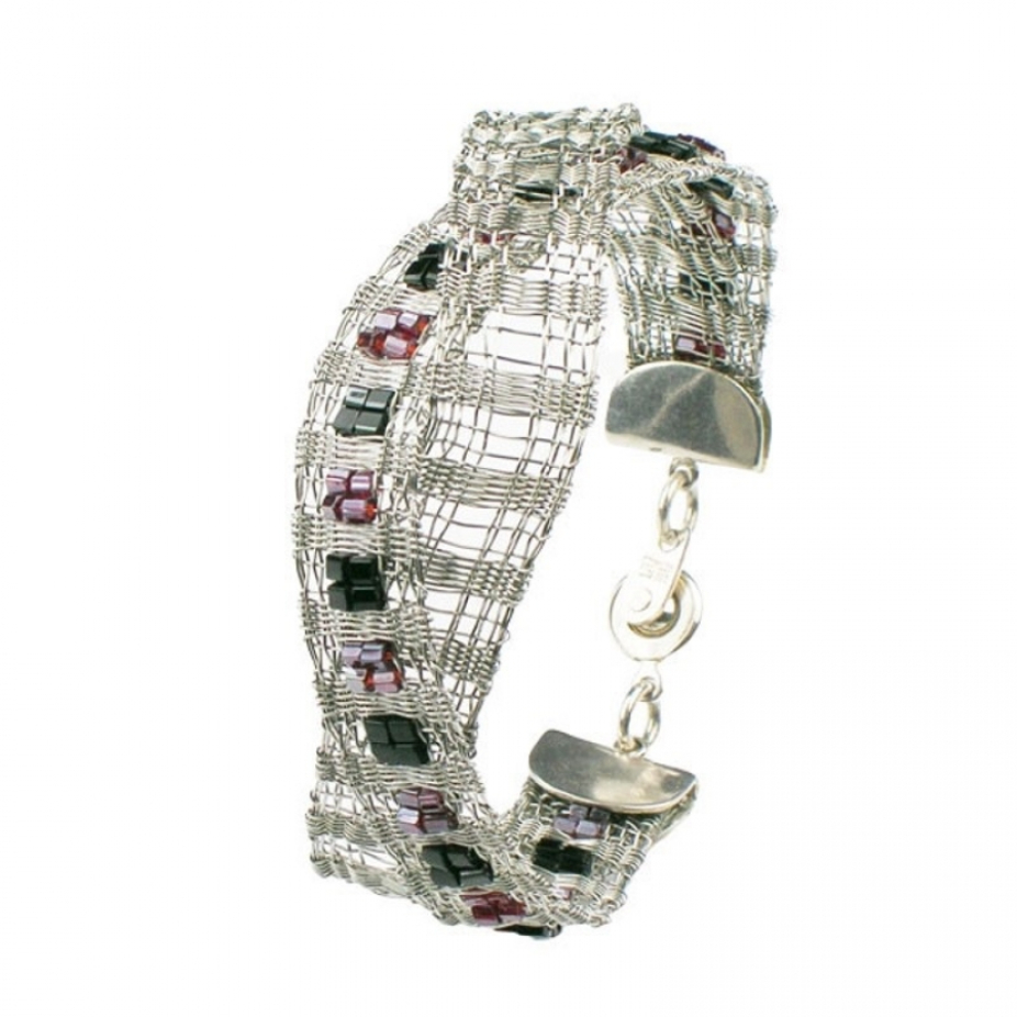 Bijoux tissées en acier inoxydable Sculptures avec tissage d’inox et autres matériaux Tableaux mélangeant du tissage d’acier inoxydable, feutre, macramé, insertion de perles et autres techniques provenant du textile.