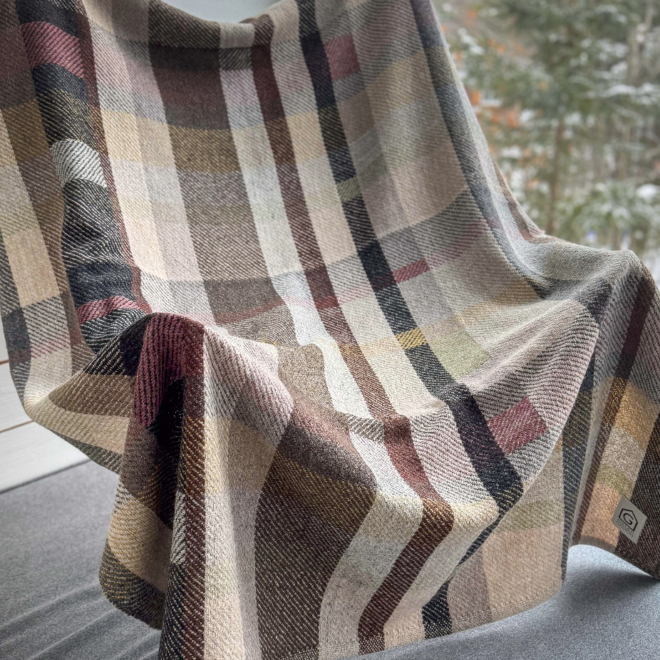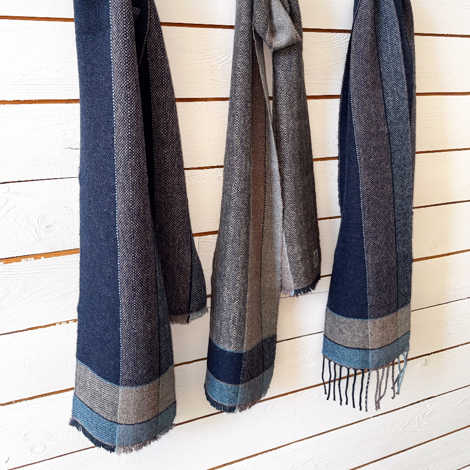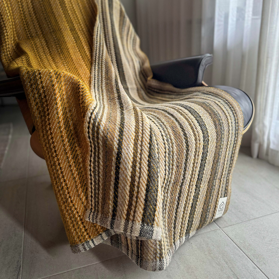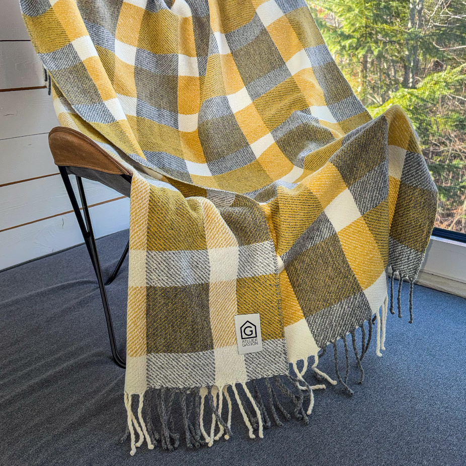 Objets utilitaires en laine 100% vierges, lin et coton, réalisés en exemplaire unique et petite série par des techniques de tissage : couvertures, nappes, foulards, écharpes, châles.