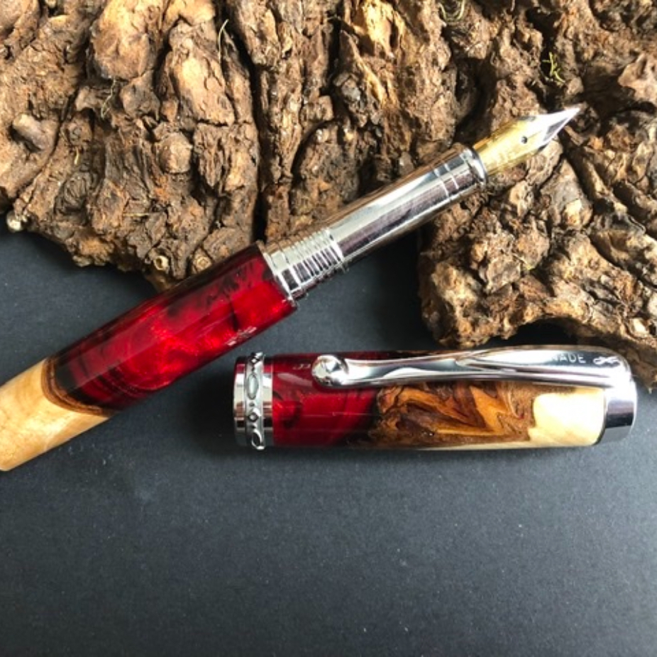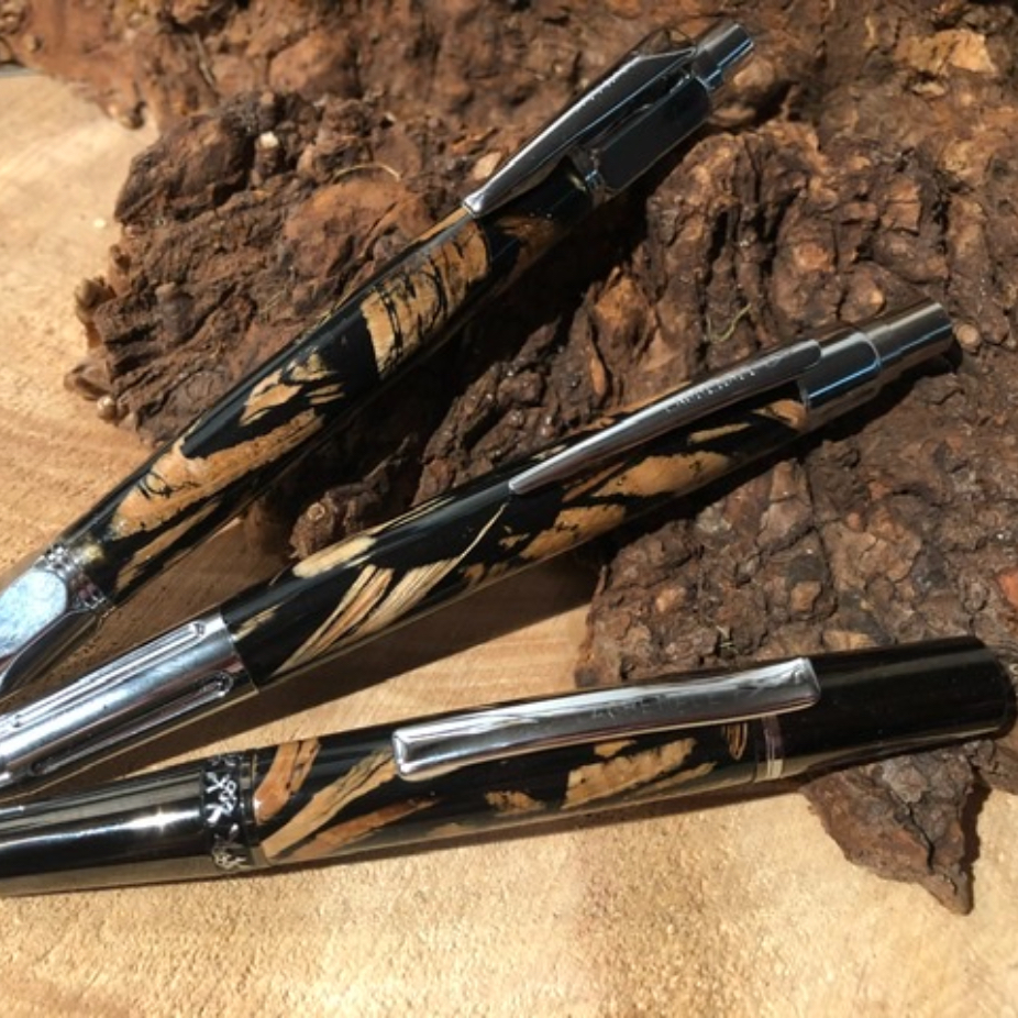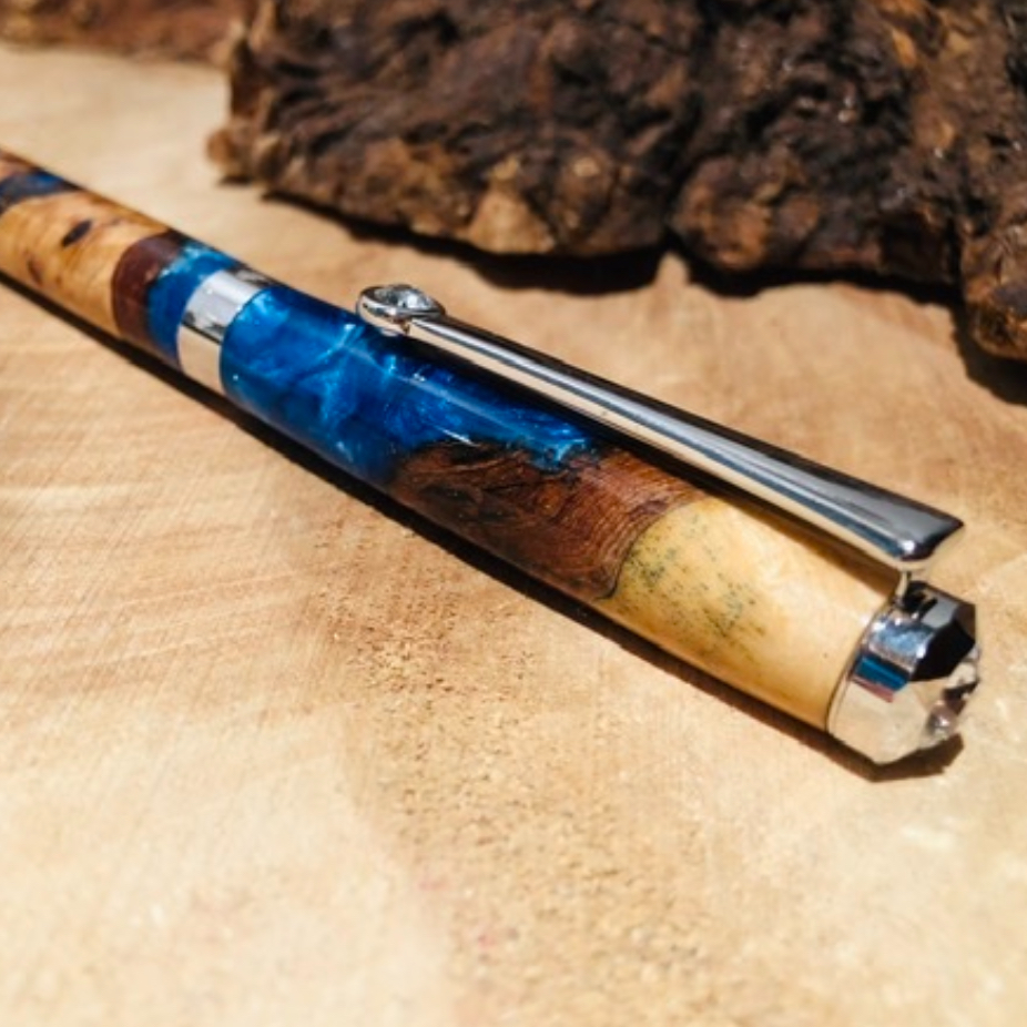 Stylos et plumes fait de fusion de loupe d’érable et acrylique, bois d’exception, acrylique, bois avec insertion de pierres semi-précieuses. Bijoux, collier en fusion de bois d’érable et résine.