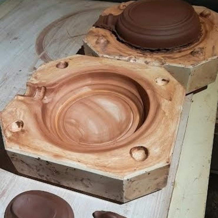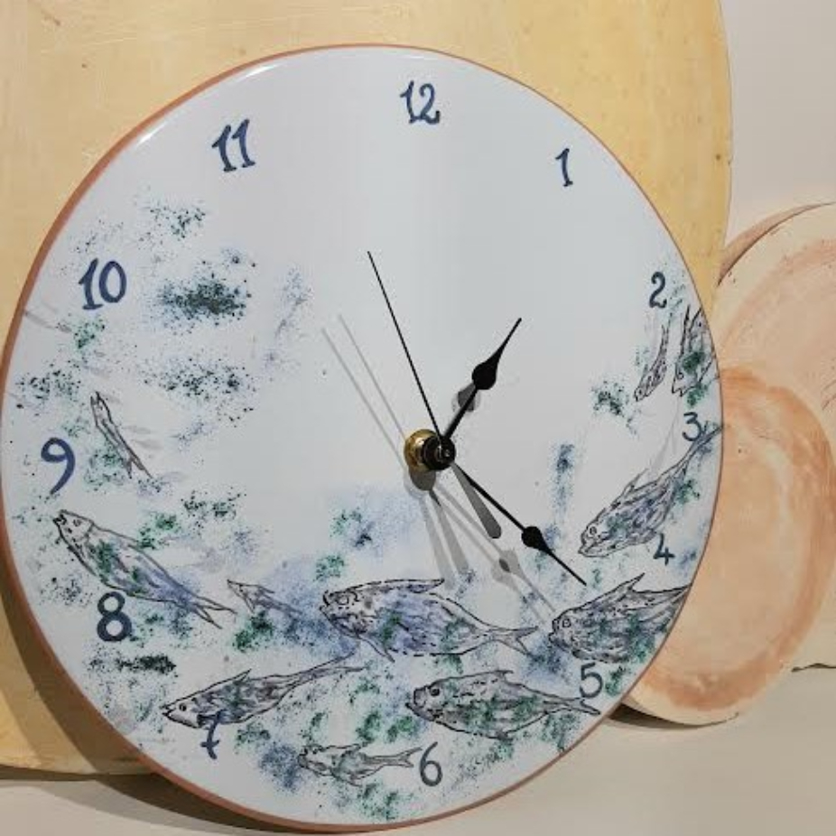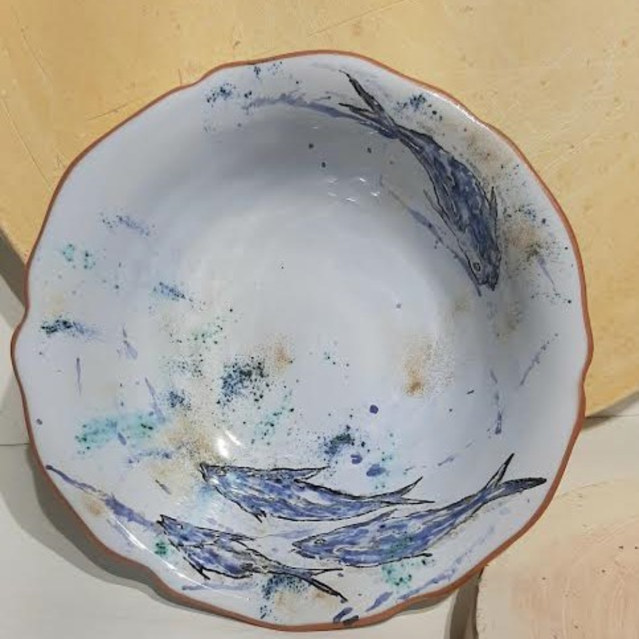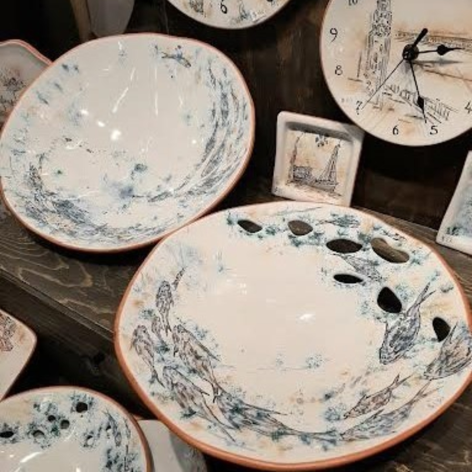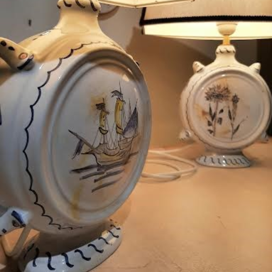 Tuiles décoratives, tuiles décoratives suspendues, lampes, saladiers, coupes, chevrettes, vases, pieds de lampe.