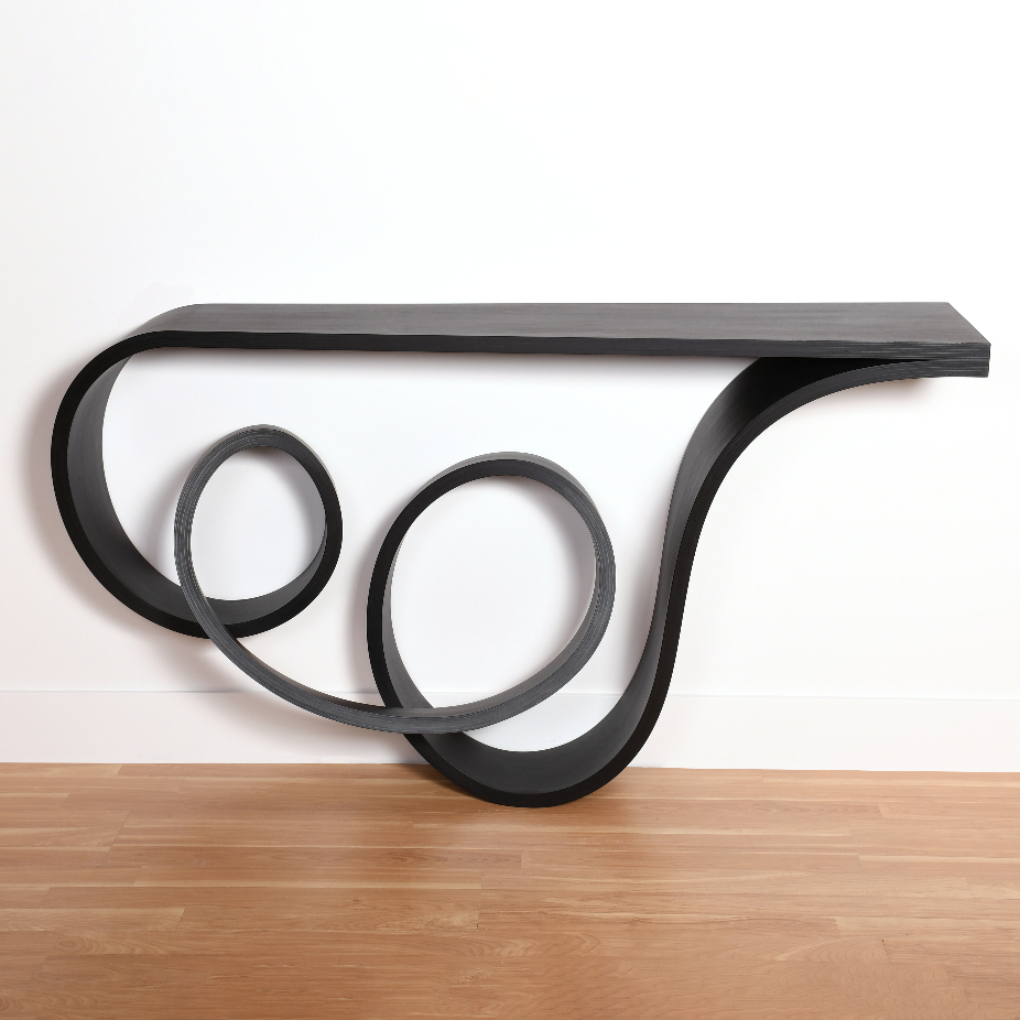 Kino Guérin, ébéniste originaire du Saguenay, reçoit sa formation en ébénisterie à l’Institut des métiers d’art au Cégep du Vieux-Montréal. Son talent est rapidement reconnu. Depuis 1998, il a reçu de nombreux prix au Québec et depuis une dizaine d’années, il reçoit régulièrement des bourses de recherche du Conseil des arts du Québec et du Canada. Kino Guérin aime les défis : faire des objets avec un seul morceau de bois. Bien sûr il n’y a pas qu’un seul morceau, il y en a plein, très minces, collés les uns par-dessus les autres pour pouvoir les courber, leur donner du mouvement.